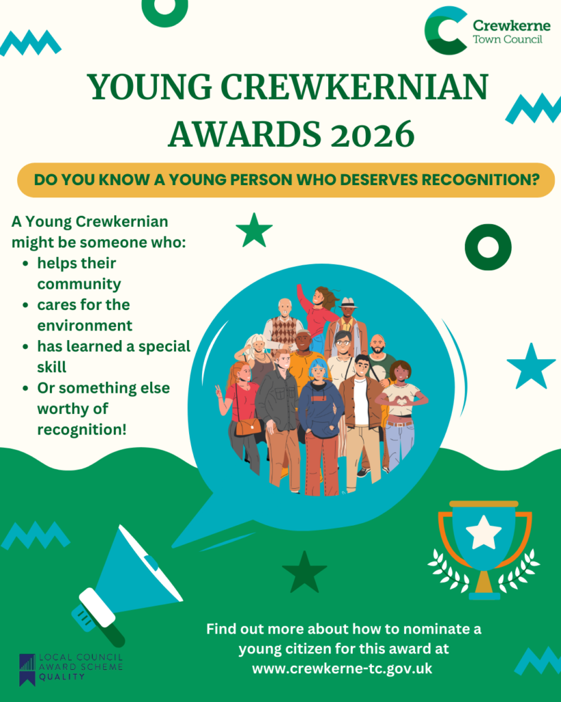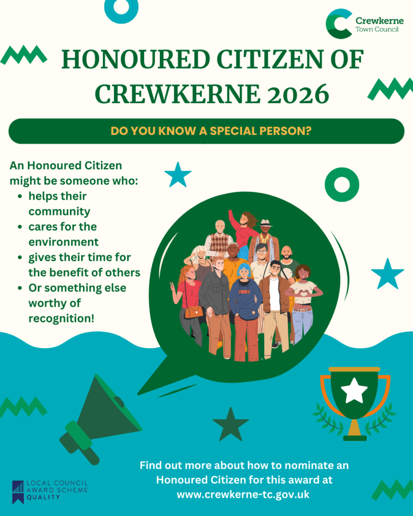 Do you know someone who has given their time over many years for the benefit of Crewkerne and our community? Is there a young person who has gone above and beyond and deserves recognition for their achievements or contribution? Nominations are now open for the Honoured Citizen of Crewkerne 2026 and the Young Crewkernian Award 2026.